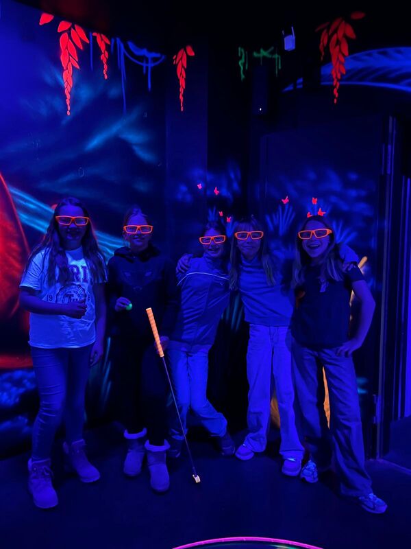 Es stand Schwarzlichtminigolf auf dem Programm. Das war ein Spaß: Die Schüler mussten wie beim herkömmlichen Minigolf mit dem Schläger den Ball mit so wenig wie möglich Schüssen ins Loch katapultieren. Zusätzliche Herausforderung war jedoch, dass man 3D Brillen aufsetzen musste, um sich in dem jeweiligen Level zurecht-zu finden.